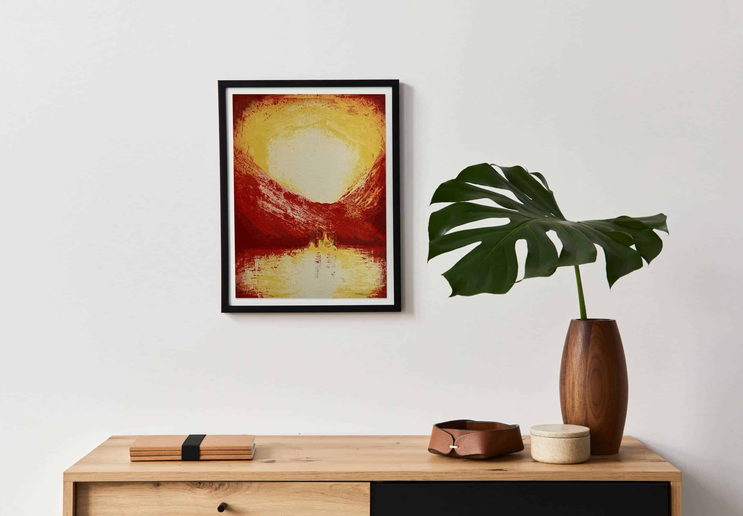 «Sommerflammer» av Ellen Hegg hinter til et abstrakt havlandskap dekket i varme toner ????