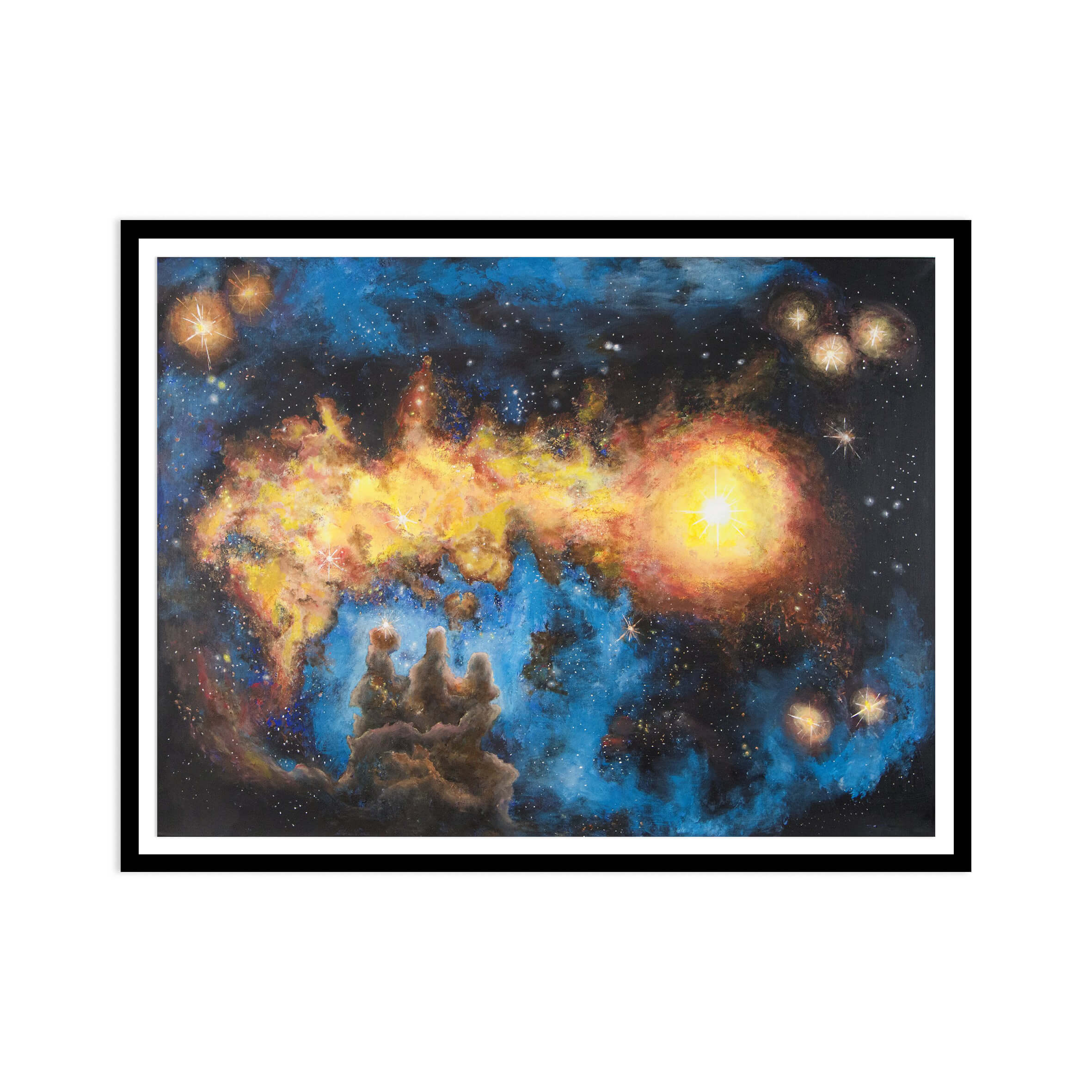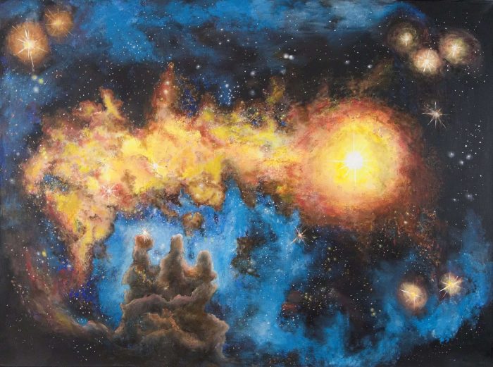 «Three pillars in space» av Sigmund Nyberg. Et maleri av «pillars of creation». Tre gigantiske søyler av molekylær gass og støv i verdensrommet som ble fotografert av Hubble-romteleskopet i 1995. Søylene befinner seg i «Eagle nebula», omtrent 7000 lysår unna i stjernebildet Serpens. ????